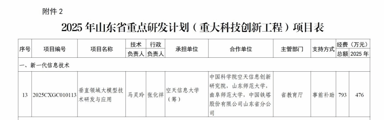 近日,山东省科技厅公布山东省重点研发计划(重大科技创新工程)项目立项结果,由空天信息大学(筹)遥感科学与技术学院牵头申报的“垂直领域大模型技术研发与应用”项目获批立项。该项目是学校筹建以来第一个由我校作为依托单位获批的省级重大科技创新项目,省财政专项资金支持800万元,标志着我校在空天遥感领域的基础研究已处于行业领先水平。