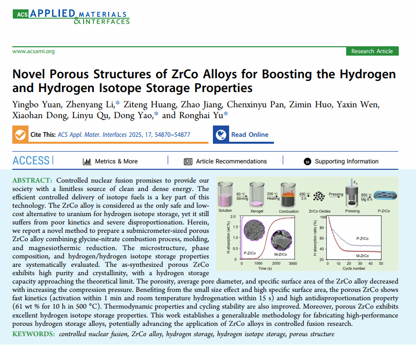 可控核聚变未来有望为人类社会提供无限的清洁、高密度能源,其中高效的氢及其同位素燃料储存与输送系统是其关键组成部分。ZrCo合金是一种安全、低成本的储氢及其同位素材料,但因传统熔铸法制备的材料受动力学差和严重歧化制约,无法大规模应用。本论文报道了一种具有多孔结构的新型ZrCo合金及其制备方法。得益于其高比表面积及小尺寸效应,所制备的多孔ZrCo合金展现出优异的储氢及氢同位素性能,包括超快动力学特性和高抗歧化性能。该研究为开发高性能多孔储氢合金提供了一种普适性的制备策略,有望推动ZrCo合金在可控核聚变研究领域的应用。