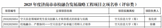 空天信息大学(筹)高度重视市校融合发展,积极探索与区域经济社会发展相适应的人才培养模式,我校“空天信息领域研究生拔尖创新人才培养模式的探索与实践”项目,着眼于高层次创新人才培养机制改革,探索适应空天信息前沿领域发展需求的研究生培养新路径;“校地融合、产教协同——空天信息产业卓越工程师人才培养”项目,聚焦于产业急需的卓越工程师培养,强调校地深度融合与产学研协同育人,为空天信息产业发展提供坚实的人才支撑。本次项目获批,不仅在服务区域发展战略、深化产教融合、创新人才培养模式等方面迈出了坚实一步,也为推动学校科研成果与地方产业深度对接,打造一批示范性科产教融合平台奠定了基础。